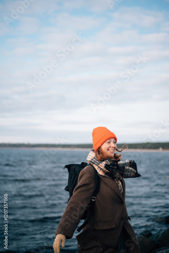 Obraz premium red-haired girl in an orange hat and coat near the sea