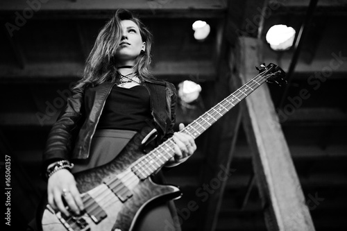 © AS Photo Family, Naklejka premium Red haired punk girl wear on black and red skirt, with bass guitar at abadoned place. Portrait of gothic woman musician.