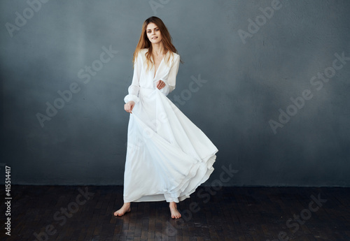 Fototapeta premium Red-haired Woman in a white dress in full growth on a gray background indoors