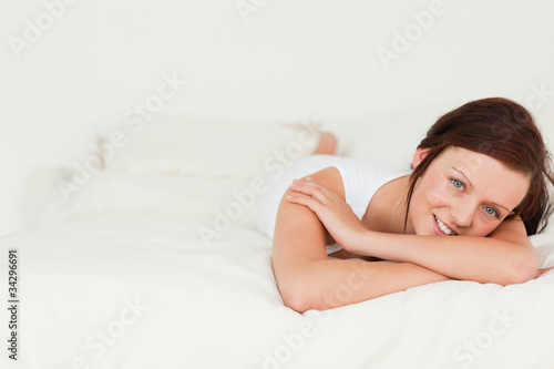 Fototapeta premium Red-haired woman relaxing on her bed looking into camera