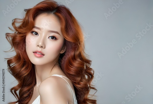 Obraz premium Red haired woman with voluminous, shiny and curly hairstyle