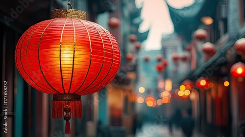 Obraz premium ' Red hanging lantern in old street at night with other lanterns blurry...