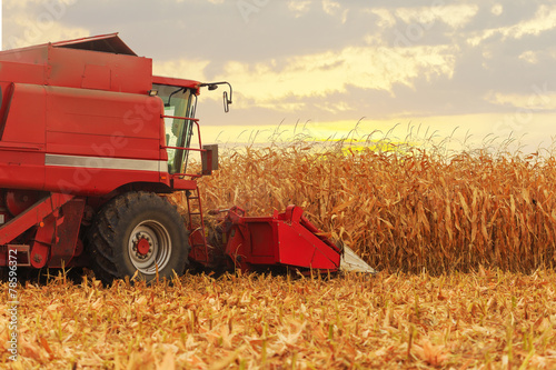 © Cristian Kerekes, Naklejka premium Red harvester working on corn field