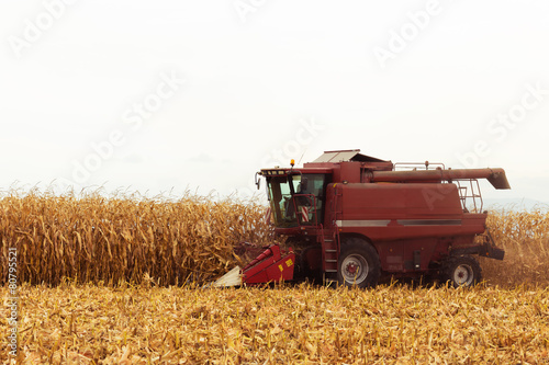 © Cristian Kerekes, Naklejka premium Red harvester working on corn field
