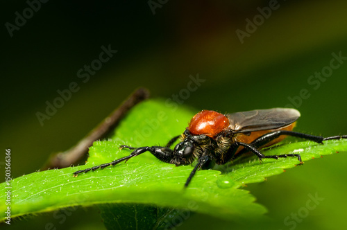 © Ridwan, Naklejka premium Red-Headed Insect Resting on a Green Leaf Outdoors