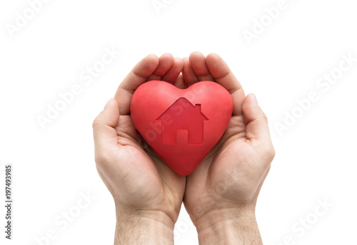Fototapeta premium Red heart with imprinted house shape in man's hands.