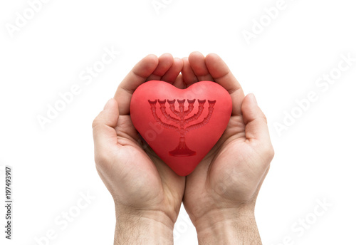 Fototapeta premium Red heart with imprinted menorah in man's hands.