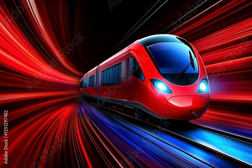 © Wiravan, Fototapeta premium Red High Speed Train in Motion Blurred Tunnel with Dynamic Lighting