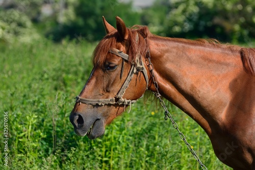 © John, Fototapeta premium Red horse on the green field
