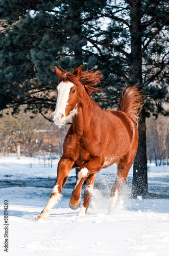 © Rita Kochmarjova, Obraz premium Red horse with white face running gallop in winter