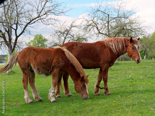 © makam1969, Fototapeta premium red horses graze in the spring meadow