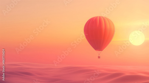 © oxart_studio, Fototapeta premium Red Hot Air Balloon Floating Above Rolling Hills During Soft And Warm Sunset