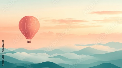 Fototapeta premium Red Hot Air Balloon Soaring Above Misty Mountains at Sunrise