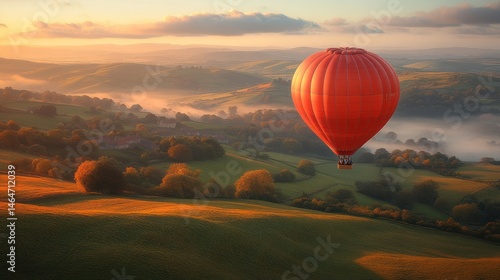 © huhu, Obraz premium Red hot air balloon soaring over misty valley at sunrise.