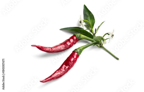 © Subbotina Anna, Obraz premium Red hot chili pepper with leaves and flowers flowers, fruits, eco bio fresh red hot cayenne chilli peppers spice plant isolated on white background. Flat lay, top view.