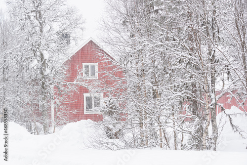 © Mikael, Naklejka premium Red house in forest during snowfall