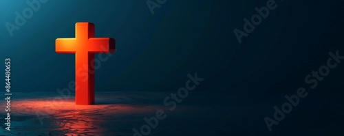 Fototapeta premium Red illuminated cross on dark background with spotlight, religious and...
