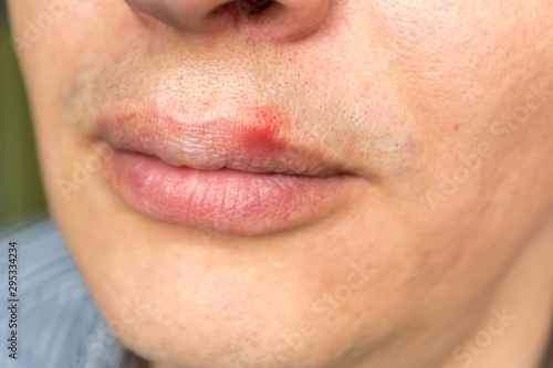 Obraz premium red inflammation and herpes zoster virus on upper male lip