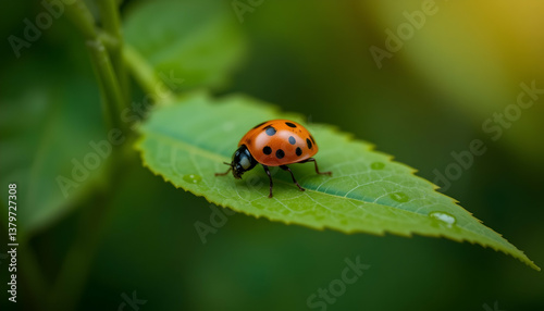 © LarisManis, Obraz premium Red insect on green leaf closeup