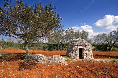 Obraz premium Red Istrian soil, stonemade shelter and olive trees