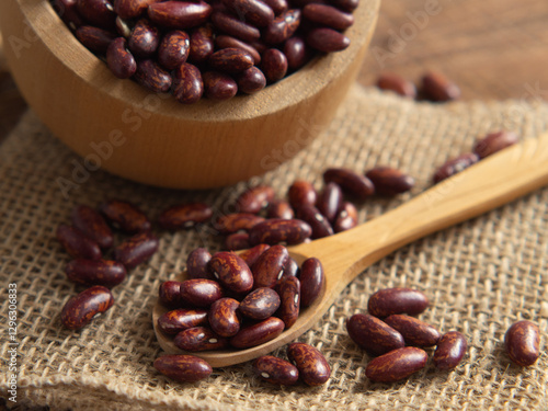 © Максим, Fototapeta premium Red kidney beans in a scoop on a wooden table against a white background.