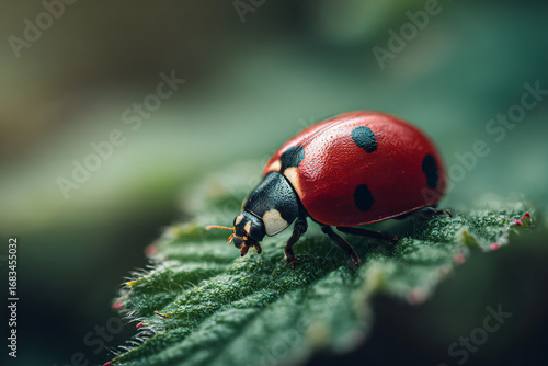 Naklejka premium Red ladybug crawling on a green leaf, macro close-up with detailed textures,...