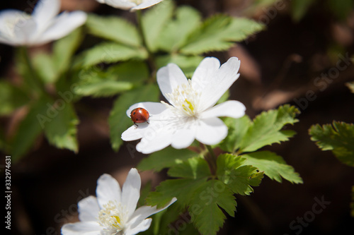 Fototapeta premium red ladybug on a white snowdrop on a sunny spring day