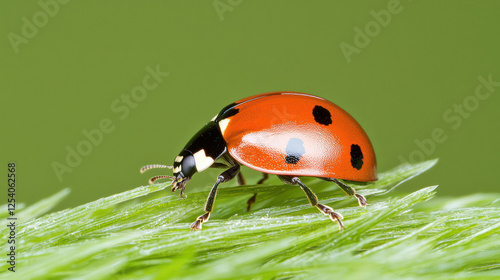 Naklejka premium Red Ladybug On Dewy Green Leaf