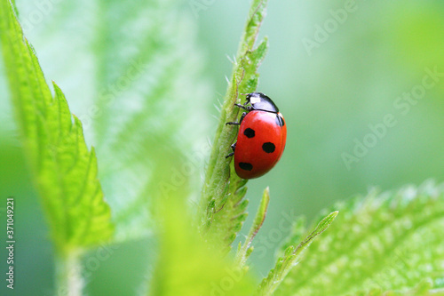 © larison, Fototapeta premium Red Ladybug on green grass and green background