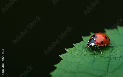 © creatfive, Obraz premium Red Ladybug on Green Leaf Against Dark Background
