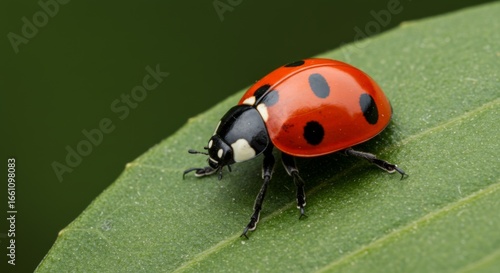 © AoiHikari, Fototapeta premium Red Ladybug on Green Leaf Closeup