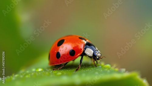 © Dhiditz, Fototapeta premium Red ladybug on green leaf with water drops, macro close-up