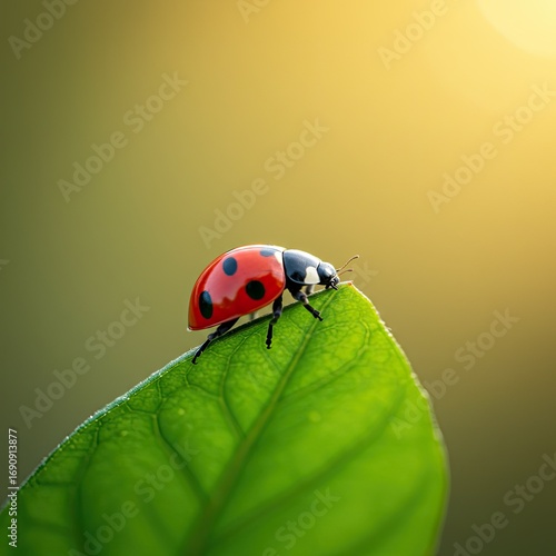 © JDP Studio 1, Fototapeta premium Red Ladybug on Vibrant Green Leaf Illuminated by Warm Sunlight A Detailed Close Up Photography