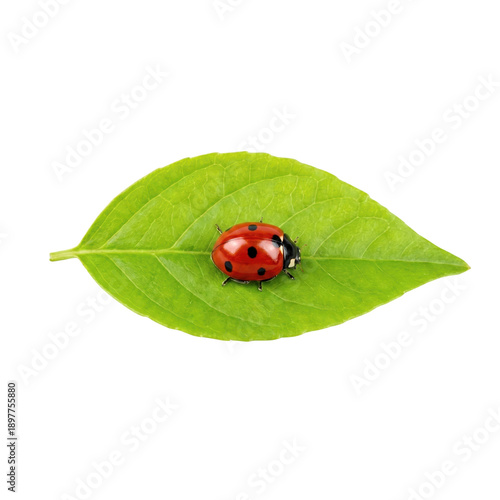 © Cutout Studio, Fototapeta premium Red ladybug with black spots resting on a vibrant green leaf.