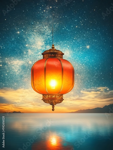 Obraz premium Red Lantern Festival Magic, Glowing Red Lantern Against Starry Night Sky