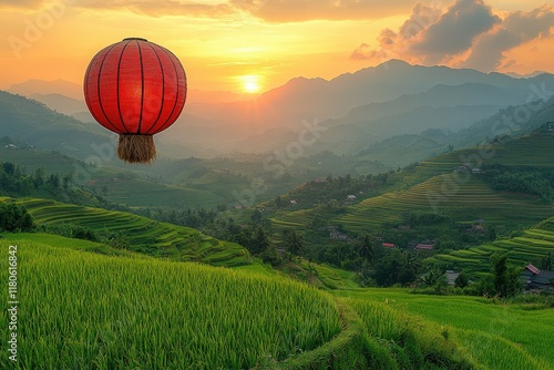 © Ali, Fototapeta premium Red lantern floats above sunset rice terraces.