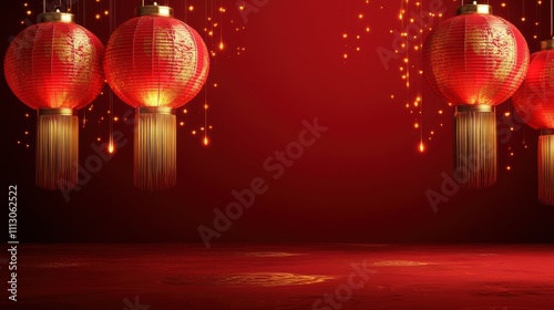 © darion, Fototapeta premium Red lanterns hanging against a vibrant red background, symbolizing celebration.
