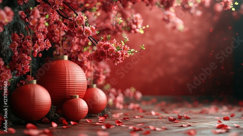 © andryan, Fototapeta premium Red Lanterns Hanging Beneath Blooming Cherry Blossoms