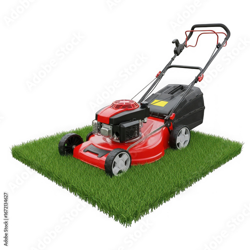 © Aklima, Obraz premium Red lawn mower on a patch of green grass, isolated on transparent background