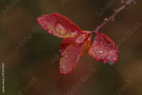 © Alyona, Fototapeta premium red leaf with dew drops