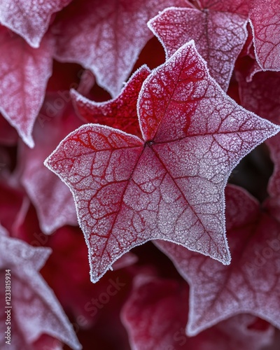 © Duskcraft, Fototapeta premium Red leaves covered with frost in a close up view showing intricate details of the leaf structure