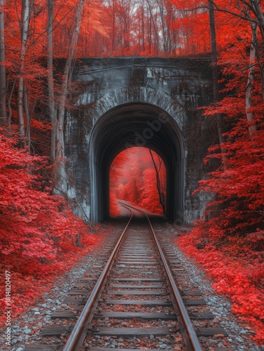 Fototapeta premium Red Leaves Frame a Serene Railway Tunnel Surrounded by Autumn Trees in a...