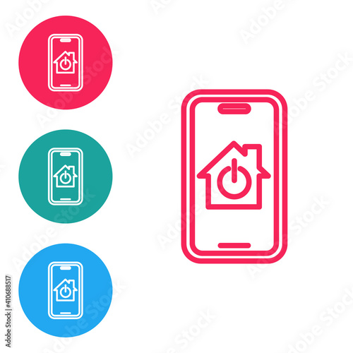 Obraz premium Red line Mobile phone with smart home icon isolated on white background. Remote control. Set icons in circle buttons. Vector.