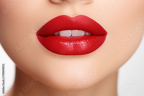 Fototapeta premium Red lipstick. Apply lipstick on the lips.