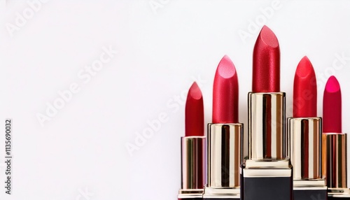 Obraz premium Red Lipstick Collection: A stylish flat lay showcasing an array of red lipsticks in varying shades, arranged elegantly against a clean backdrop. Perfect for beauty blogs, makeup tutorials.