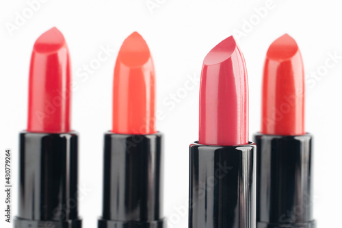 Obraz premium Red lipsticks of different shades in black tube package over white...
