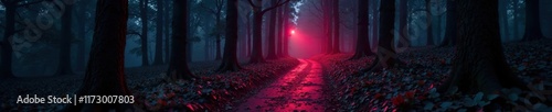 © Prasert, Obraz premium Red lit pathway winding through the black forest, forest, eerie, pathway