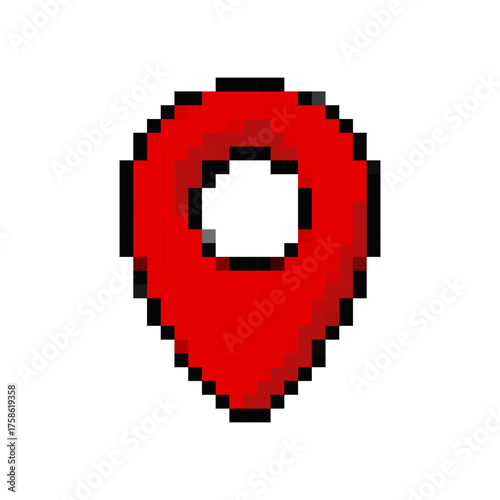 © Maryna, Obraz premium Red location pin in pixel style. Retro 8-bit design icon for maps, navigation, games, or digital projects. Vector illustration isolated on white background.