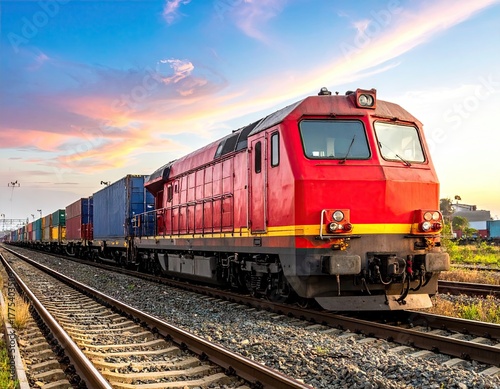 © siska, Fototapeta premium Red Locomotive Pulling Cargo Containers Under Blue and Orange Sky