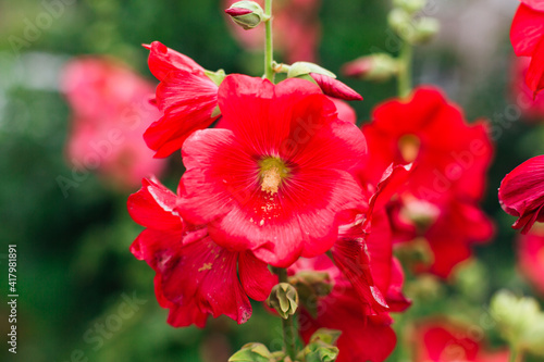 © Smile, Fototapeta premium Red mallow flowers in a green yard